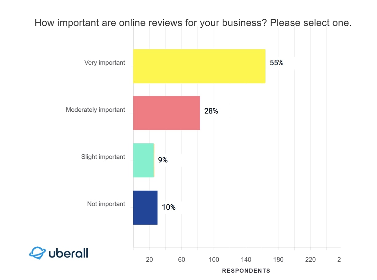 Auf die Frage, wie wichtig Inhaber kleiner und mittlerer Unternehmen Online-Bewertungen für wichtig halten, antworteten 54 Prozent „sehr wichtig“, 28 Prozent meinen, sie seien „mäßig wichtig“. Darüber hinaus glauben 9%, dass Online-Bewertungen für ihr Unternehmen „geringfügig wichtig“ sind, und 9% glauben, dass sie überhaupt nicht wichtig sind.