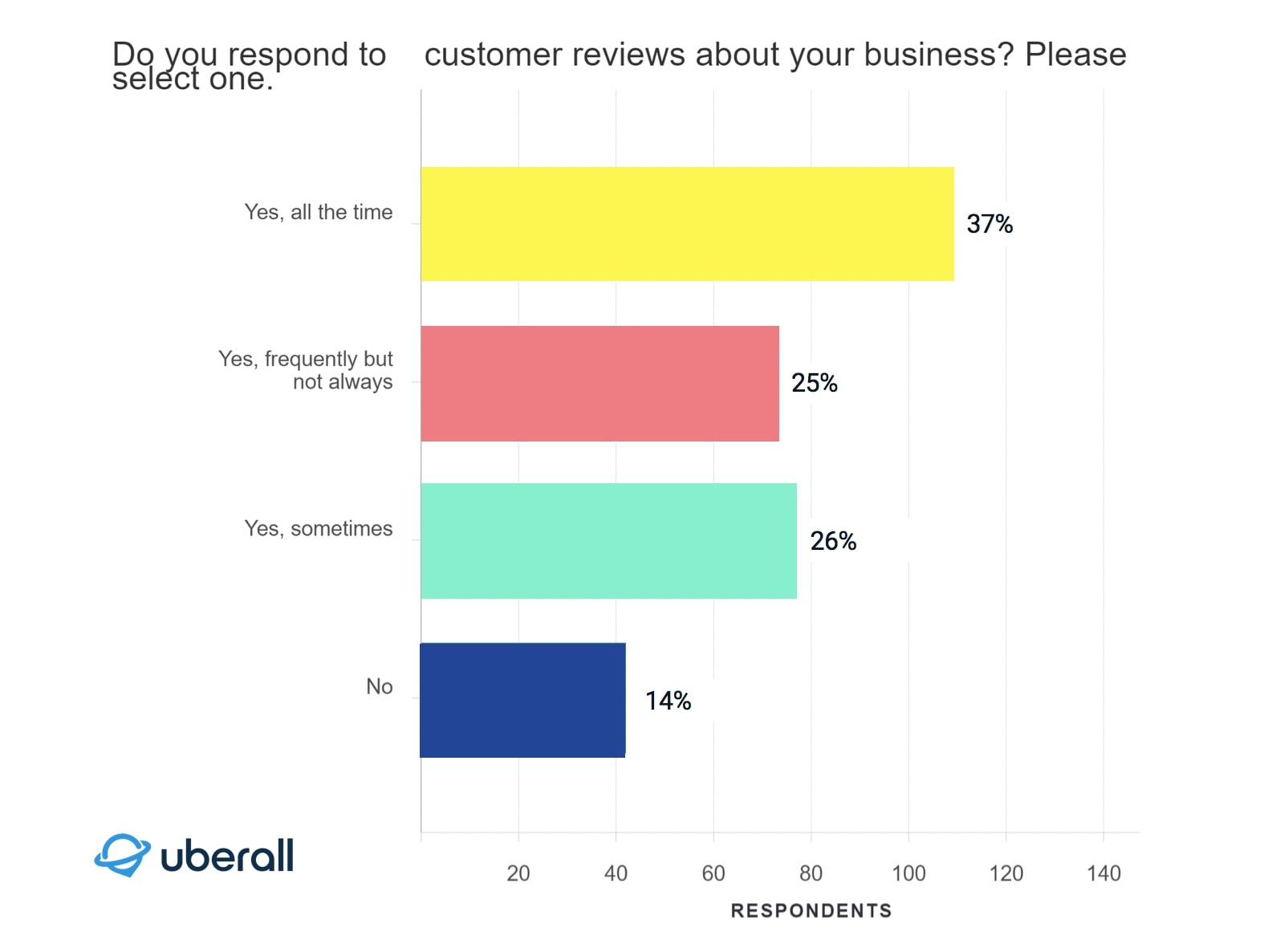Sobald ein Kunde eine Bewertung online veröffentlicht, liegt es an dem Unternehmen, ob er darauf reagiert oder nicht. Und es stellt sich heraus, dass die meisten von ihnen dies tun. Laut der Studie von Uberall antworten 37% der KMUs immer auf Online-Bewertungen, während 25% angeben, dass sie „häufig“ antworten, aber nicht immer. Darüber hinaus geben 26% an, dass sie „manchmal“ antworten, und 14% tun dies nie.