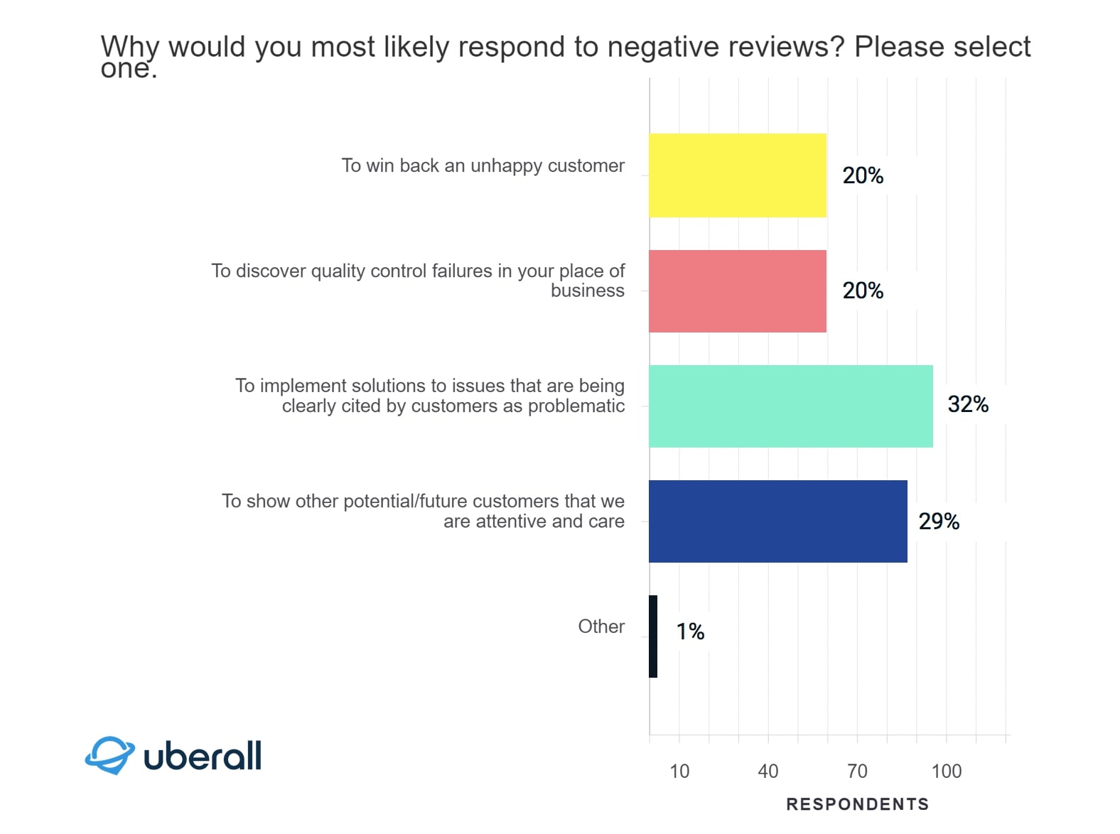Auf die Frage, warum ein KMU wahrscheinlich auf eine negative Bewertung reagieren würde, gaben 32% an, „Lösungen für Probleme zu implementieren, die von Kunden eindeutig als problematisch bezeichnet werden“. Andere Antworten lauteten „anderen potenziellen/zukünftigen Kunden zu zeigen, dass wir aufmerksam und fürsorglich sind“ (29%), „Fehler bei der Qualitätskontrolle in Ihrem Unternehmen zu entdecken“ (20%), „einen unzufriedenen Kunden zurückzugewinnen“ (20%) und „Andere“ (1%).