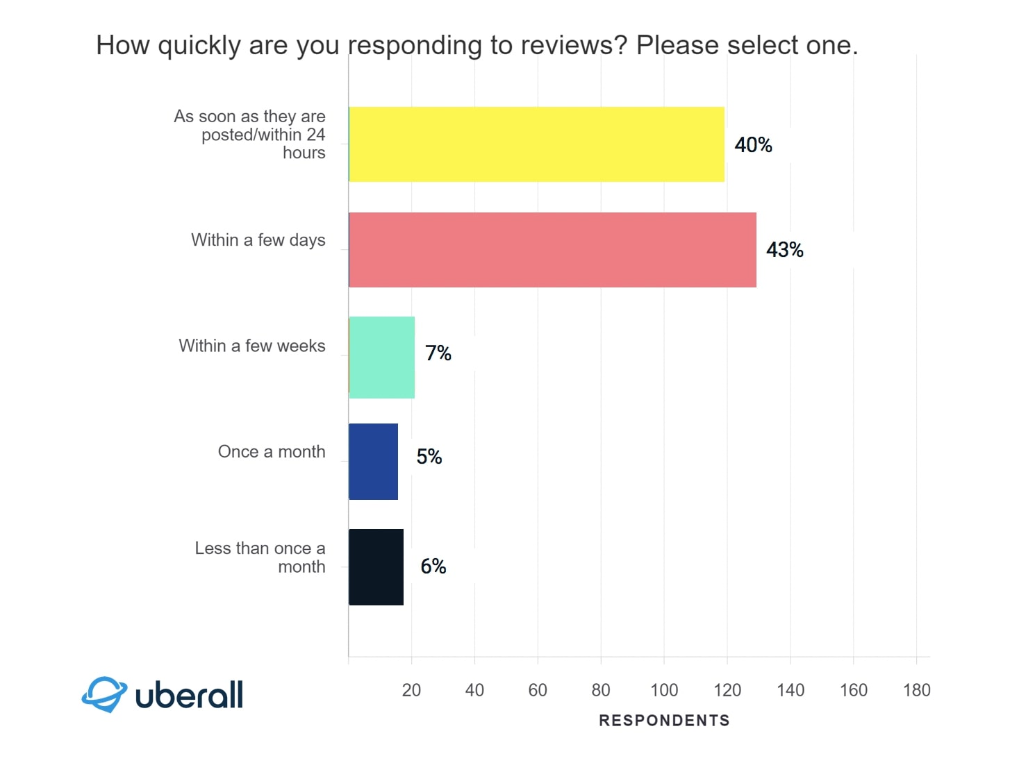 Die Umfrage von Uberall ergab, dass KMUs in der Regel relativ schnell auf Kundenrezensionen reagieren. Dreiundvierzig Prozent antworten „innerhalb weniger Tage“, während 39% entweder sofort nach der Veröffentlichung oder innerhalb von 24 Stunden antworten. Andere Antworten waren „innerhalb weniger Wochen“ (7%), „einmal im Monat“ (5%) oder „weniger als einmal im Monat“ (6%).