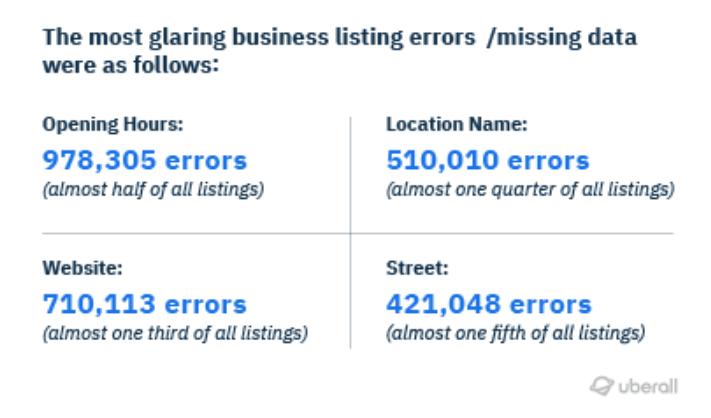- Was fehlt? Uberall identifizierte die Kategorien von Geschäftsinformationen, in denen am häufigsten die Öffnungszeiten fehlten, die eklatantesten Angebotsfehler/fehlenden Daten. Uberall fand 978.305 Fehler bei den Öffnungszeiten aller Angebote, was fast der Hälfte aller analysierten Standorte entspricht.