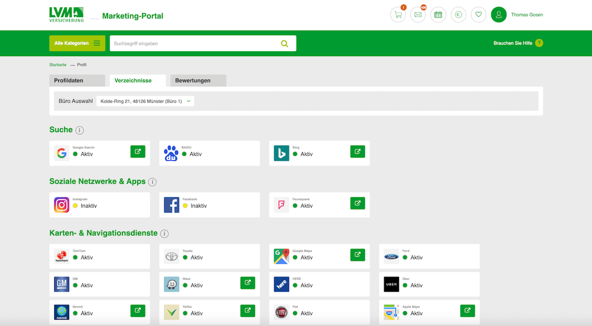 Die LVM suchte nach einer Lösung, mit der die LVM-Versicherungsagenturen ihre lokalen Zielgruppen auf Google, Apple Maps oder Facebook erreichen. Gleichzeitig war klar, dass ein Tool nur dann geeignet ist, wenn die Vertrauensleute der LVM es besonders leicht nutzen können, also in dem für sie gewohnten Marketing-Portal.