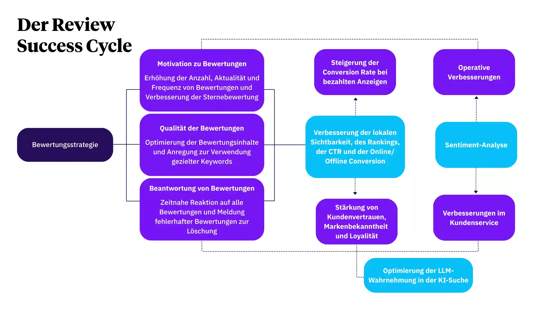 Ein effektives Bewertungsmanagement sorgt für eine höhere Conversion Rate und eine bessere Click-Through-Rate, insbesondere bei Google Unternehmensprofilen und lokalen Suchergebnissen. KI-Systeme nutzen bei der Bewertung und Beschreibung von Unternehmen zunehmend auch die Inhalte aus der Beantwortung von Kundenbewertungen. So ergibt sich auf einer zusätzlichen Ebene eine höhere Sichtbarkeit und Glaubwürdigkeit, die wiederum positiven Einfluss auf den Gesamterfolg nimmt.