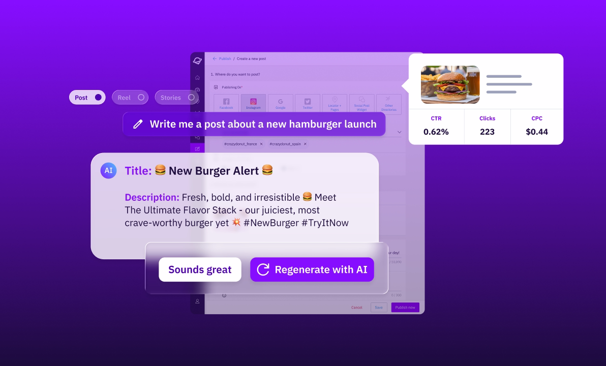 • Create on-brand posts with AI, aligned with your tone, local relevance, and conversions.