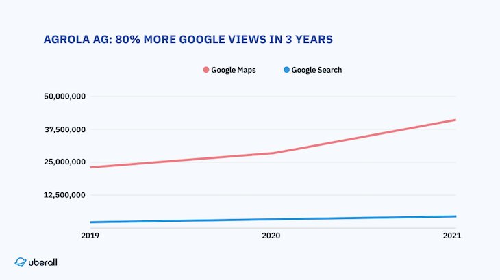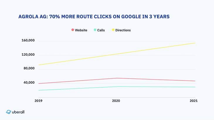 Nel 2021, AGROLA ha registrato oltre 150.000 clic di questo tipo su Google Maps, il 70 percento in più rispetto al 2019. La crescita di tutte le conversioni, comprese le chiamate e i clic sul sito Web, è del 57%.